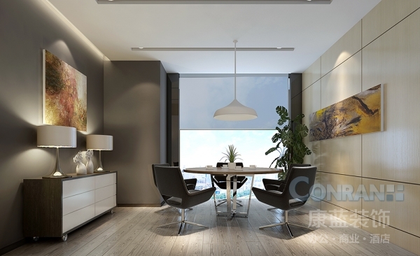 與黑色奢華的接待空間不同,圓桌會議區(qū)更多是用于公司內(nèi)部的會議,追求的是雅致、清幽的空間氛圍,因此在燈具和矮柜上多用暖白色,多用弧形的家具增設(shè)空間的柔和感,深淺對立的兩墻裝飾有抽象繪畫作品,充分體現(xiàn)康藍(lán)團(tuán)隊(duì)將當(dāng)代藝術(shù)加入裝飾設(shè)計(jì)的野心。